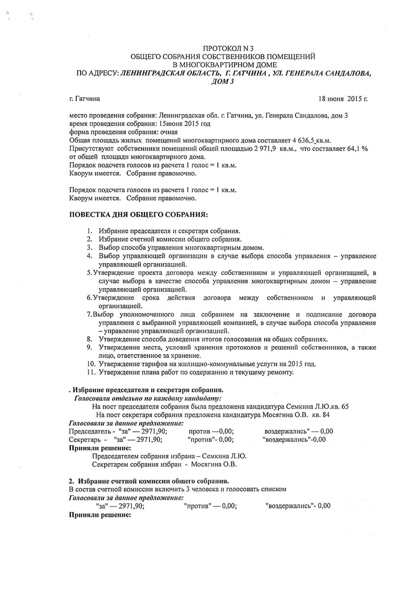 Основание: Протокол №3 (читать подробнее) общего собрания собственников помещений в многоквартирном доме по адресу: Ленинградская обл., г.Гатчина, ул.Сандалова, дом 3 от 18 июня 2015года.